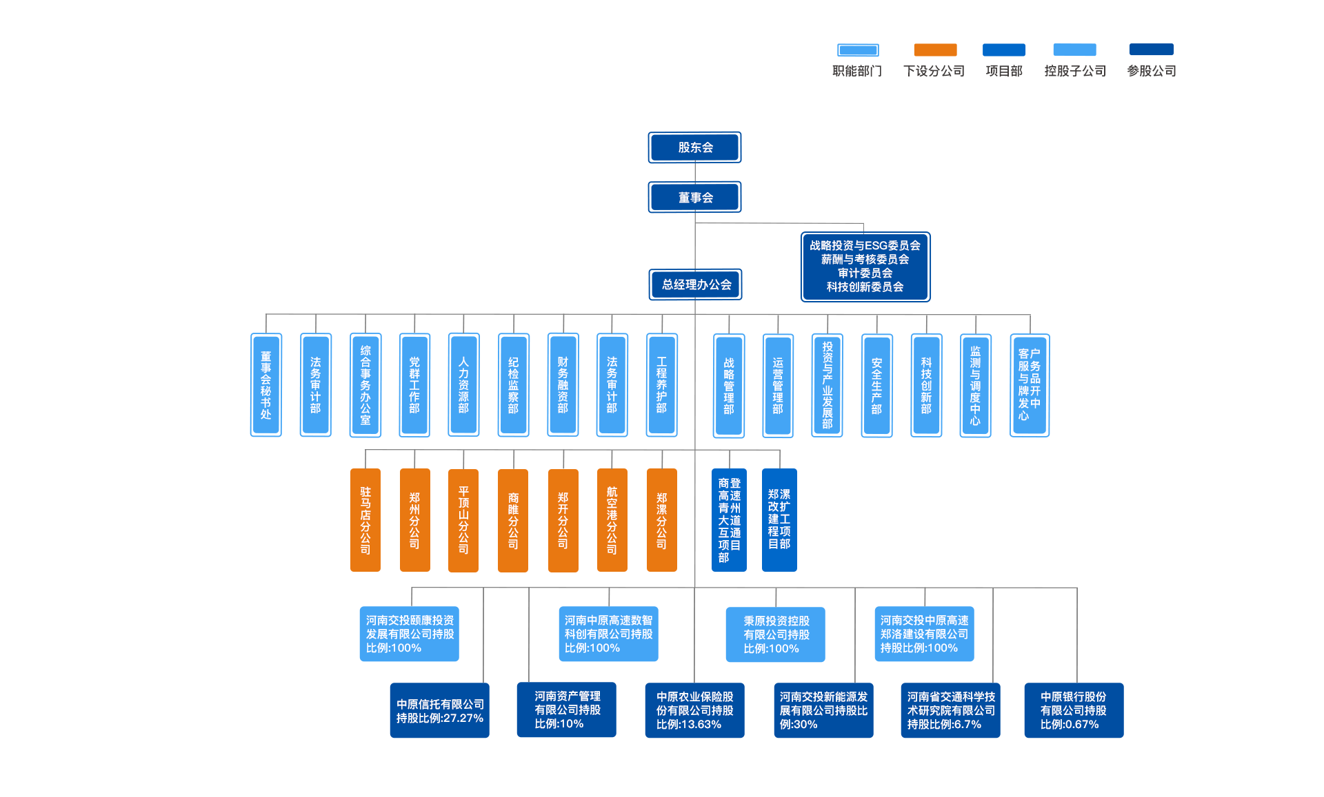 在主業(yè)穩(wěn)健的基礎(chǔ)上,公司大力發(fā)展多元化項(xiàng)目,目前已形成了以高速公路經(jīng)營為主,股權(quán)債權(quán)投資、基金、房地產(chǎn)、信托、保險(xiǎn)、銀行、路域經(jīng)濟(jì)開發(fā)為輔的多元化發(fā)展戰(zhàn)略格局。目前擁有全資子公司4家,分別為:秉原投資控股有限公司、河南交投中原高速鄭洛建設(shè)有限公司、河南交投頤康投資發(fā)展有限公司、河南中原高速數(shù)智科創(chuàng)有限公司。參股企業(yè)6家,分別為:河南交投新能源發(fā)展有限公司、中原信托有限公司、中原農(nóng)業(yè)保險(xiǎn)股份有限公司、河南資產(chǎn)管理有限公司、河南省交通科學(xué)技術(shù)研究院有限公司、中原銀行股份有限公司。